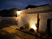 グラフィックは上から下への光。植栽へのアップライトは下から上の光なので近い位置でも、光と光の干渉はしないと考え配置した。植栽のライトアップは樹木を照らすための場合と、シャドーを目的でする場合があるが今回は前者。植栽は光が抜けるものを選ぶ。