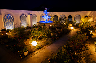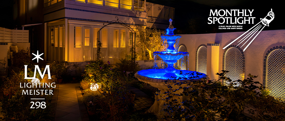 今回のライティングは、昼間の*「地中海×モロッコ」のテーマを夜間に昇華させることに注力しました。 庭全体は、シンメトリーな外構デザインを基調とし、広々とした空間に落ち着きと秩序をもたらしています。特に目を引くのは、地中海とモロッコのエッセンスを凝縮した飾壁はアーチ型ニッチを造作し、縁取り部分とニッチ部分に青いタイルを施しました。ニッチ部分に使用した青いタイルは繊細なデザインが特徴で、夜間にはタカショーのホールスタンドライト・ローボルト250とエバーアートポールライト・ローボルト10型が、これらの青いタイルやアーチの陰影を際立たせ、昼間とは異なる幻想的な表情を生み出しています。 控壁同様の青いタイルが貼られ、全体として統一感のある異国情緒あふれる空間を演出。これらのタカショー製LED照明を連携させることで、省エネ性と利便性も両立し、昼夜問わず美しい庭を創造しました。