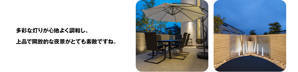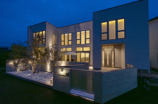 お施主様にご提案した3DCADでは、エクステリアだけではなく建物も忠実に再現、夜のライティングなど細かくリアルにシミュレートし、完成イメージをご提案しました。その結果『思い通りの空間になった』とご満足いただけました。