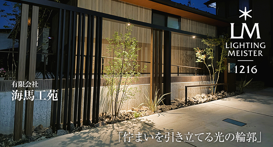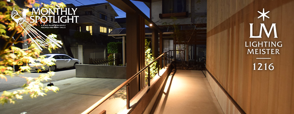 今回は格子と植栽をバランスよく照らし出し、同じダウンライトの灯りで玄関への通路も照らすよう計画しています。意匠性と実用性を兼ね備えたライティングデザインを提案しています。