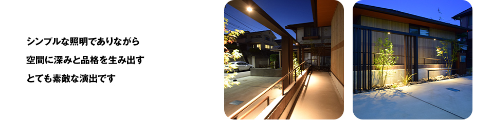 ライティングで最も魅せたいのは“陰影”です。光がつくる影が空間に奥行きと詩情を与えます。限られた敷地でも、光の配置次第で空間に広がりと奥行きを持たせることができます。